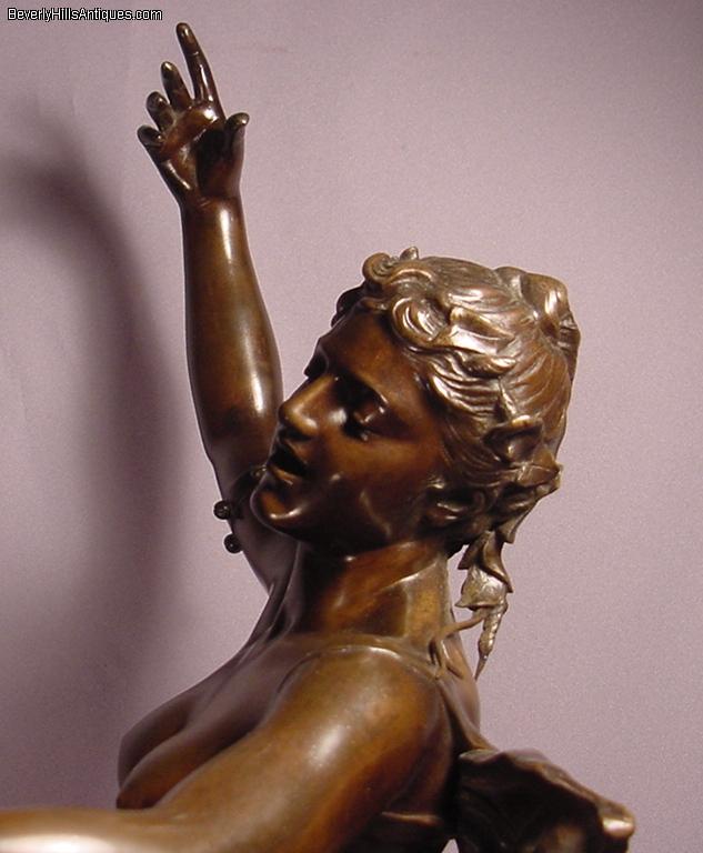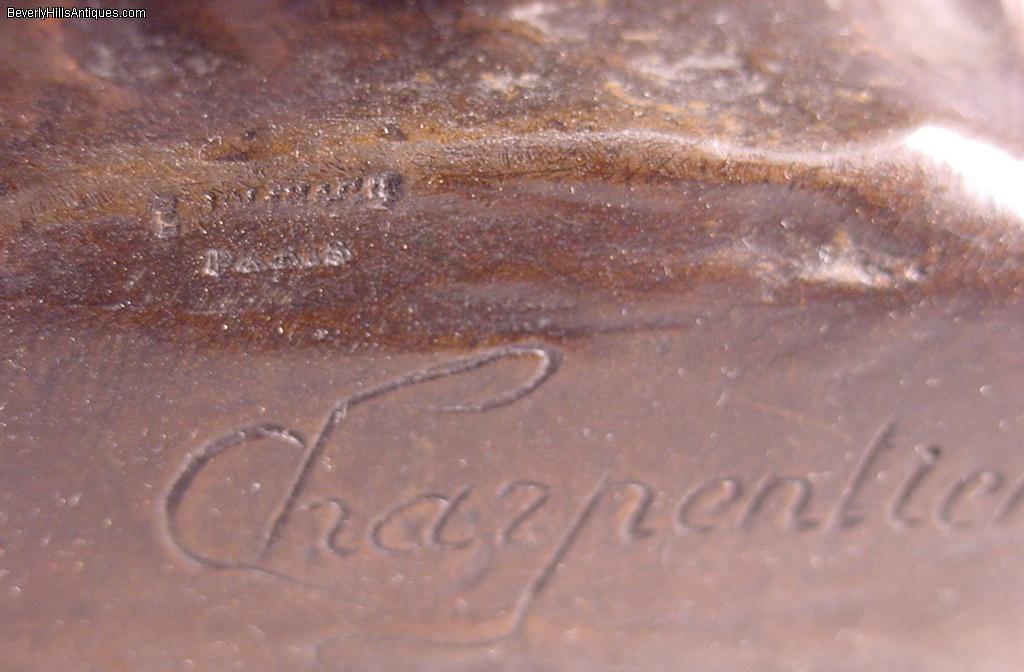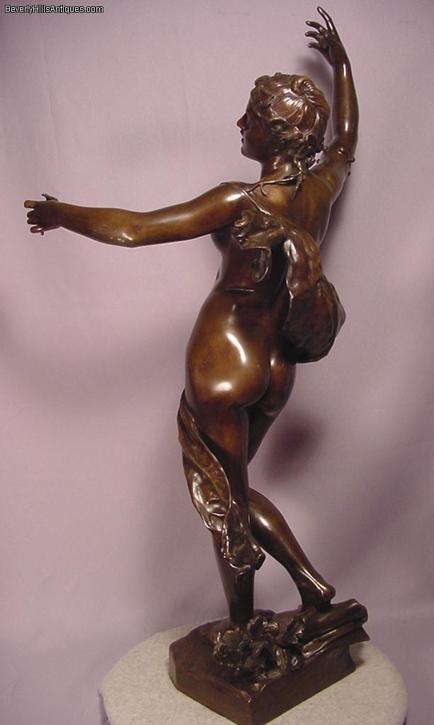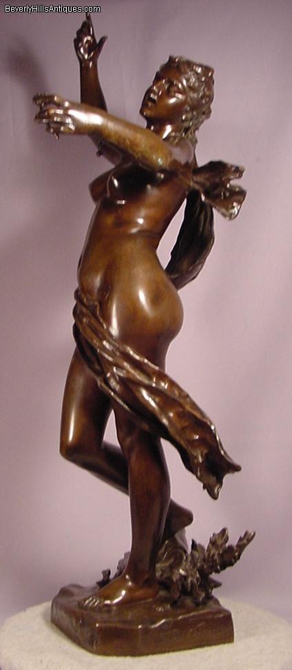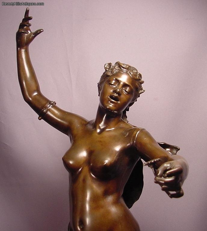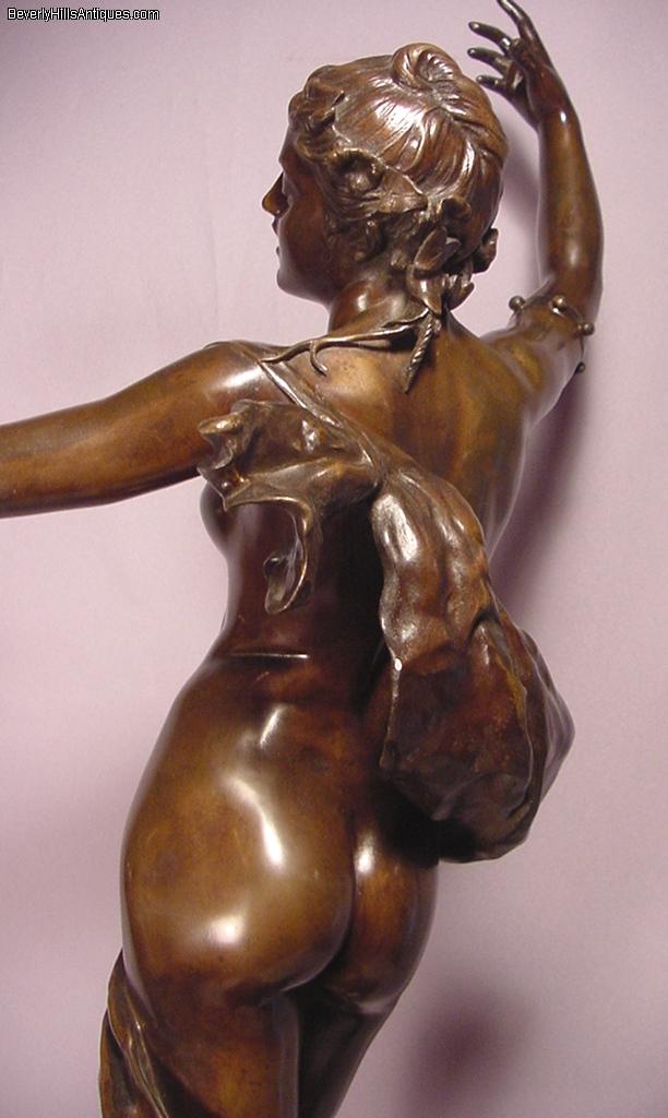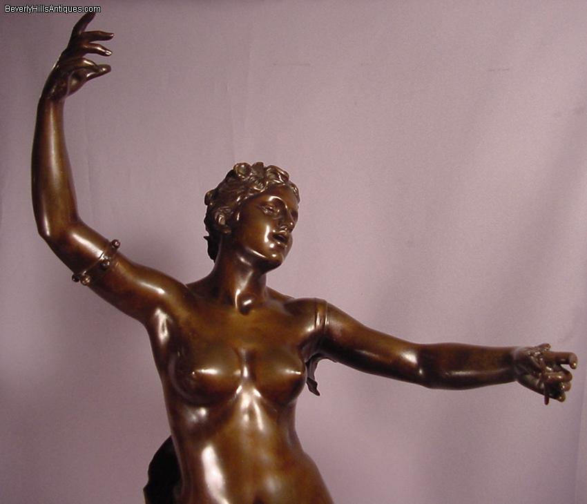 Exquisite antique bronze nude lady dancer signed Charpentier. She is wearing only a sash draped over one shoulder and an arm band with bells. She holds a little flower in her hand as she dances. Her right foot stands on sheets of music, a jester head, and a tambourine. Inscribed on the side is Felix Charpentier and E. Colin & Cie Paris. The bronze measures 26-3/4 inches high. From finger tip to finger tip she measures 14-1/4 inches. The base she stands on measures 6 inches high. Widest width at base 8-1/2 inches including the jester head an foliage on the base. Weight 32 lbs. This sculpture was created in 3 sizes, one monumental, one large and one smaller size. This is the middle size next to the very largest monumental one. It has a medium chocolate brown patina and is in excellent condition. This is one of the most beautiful examples of this model we have had the pleasure to sell and the largest example we have owned. Guaranteed to please the most particular collector or connoisseur.