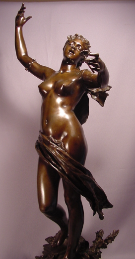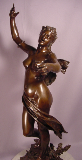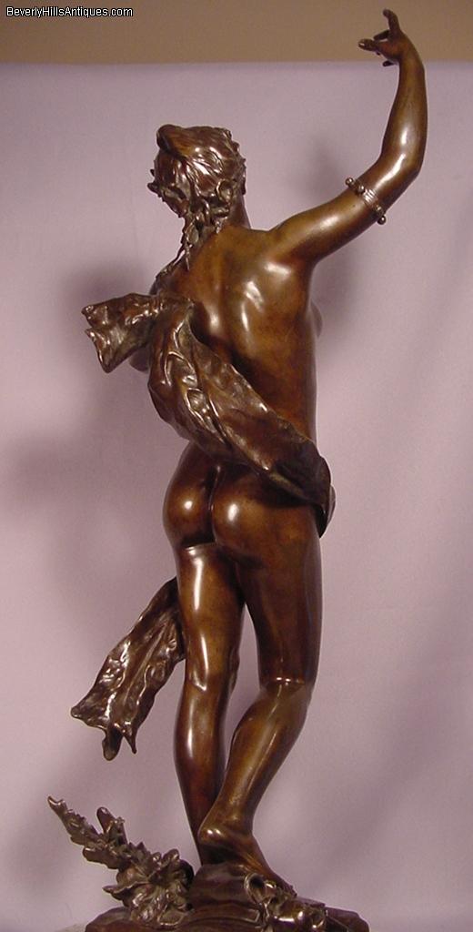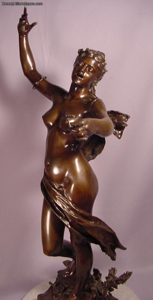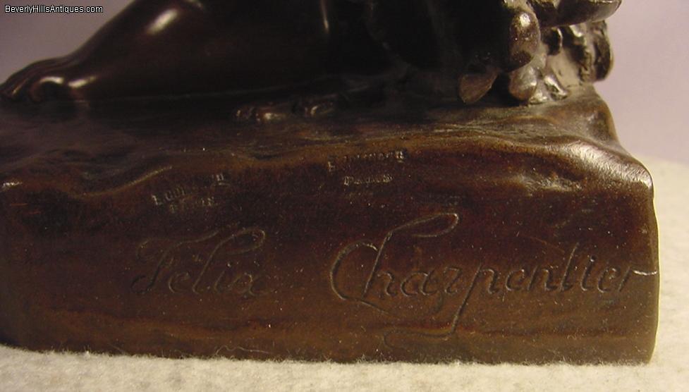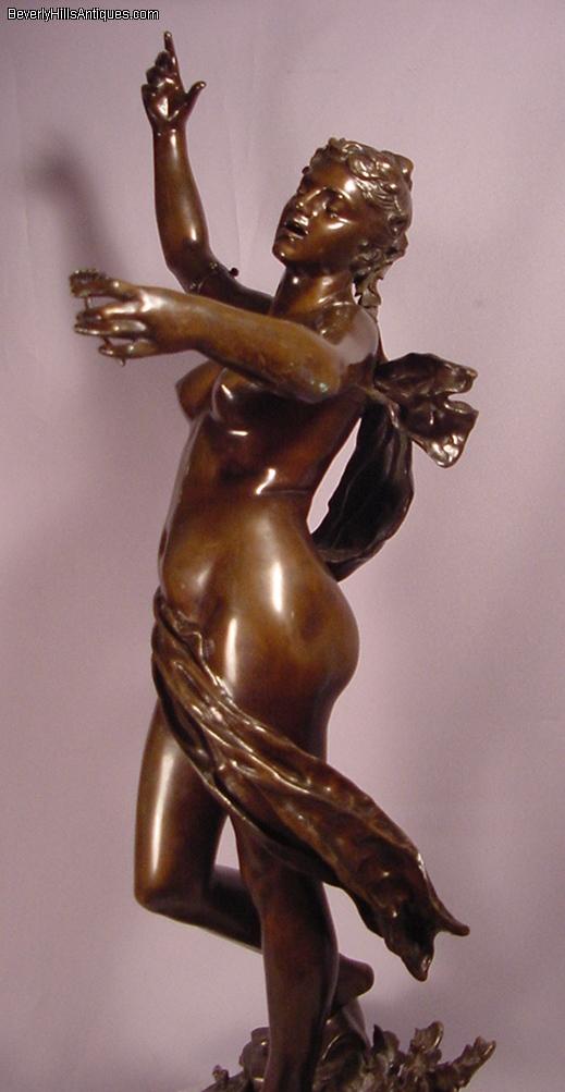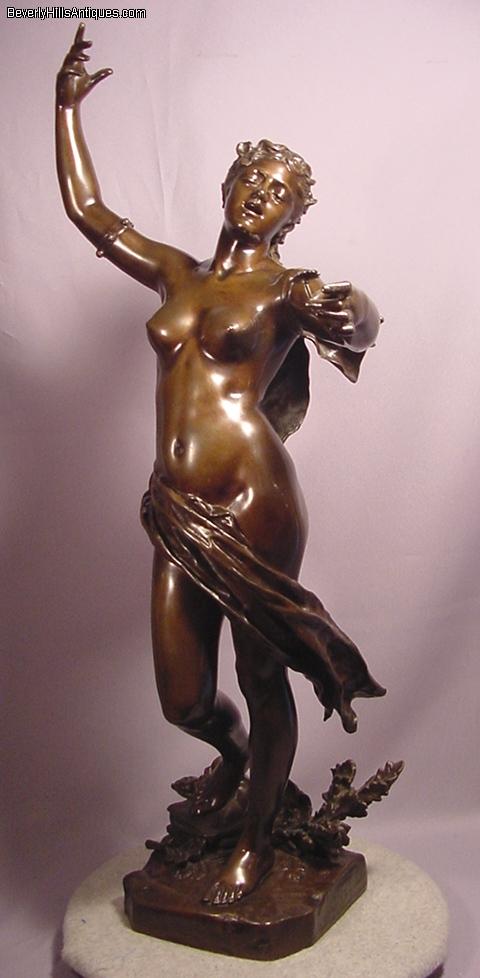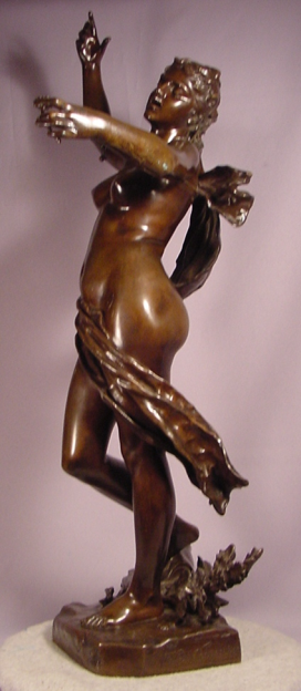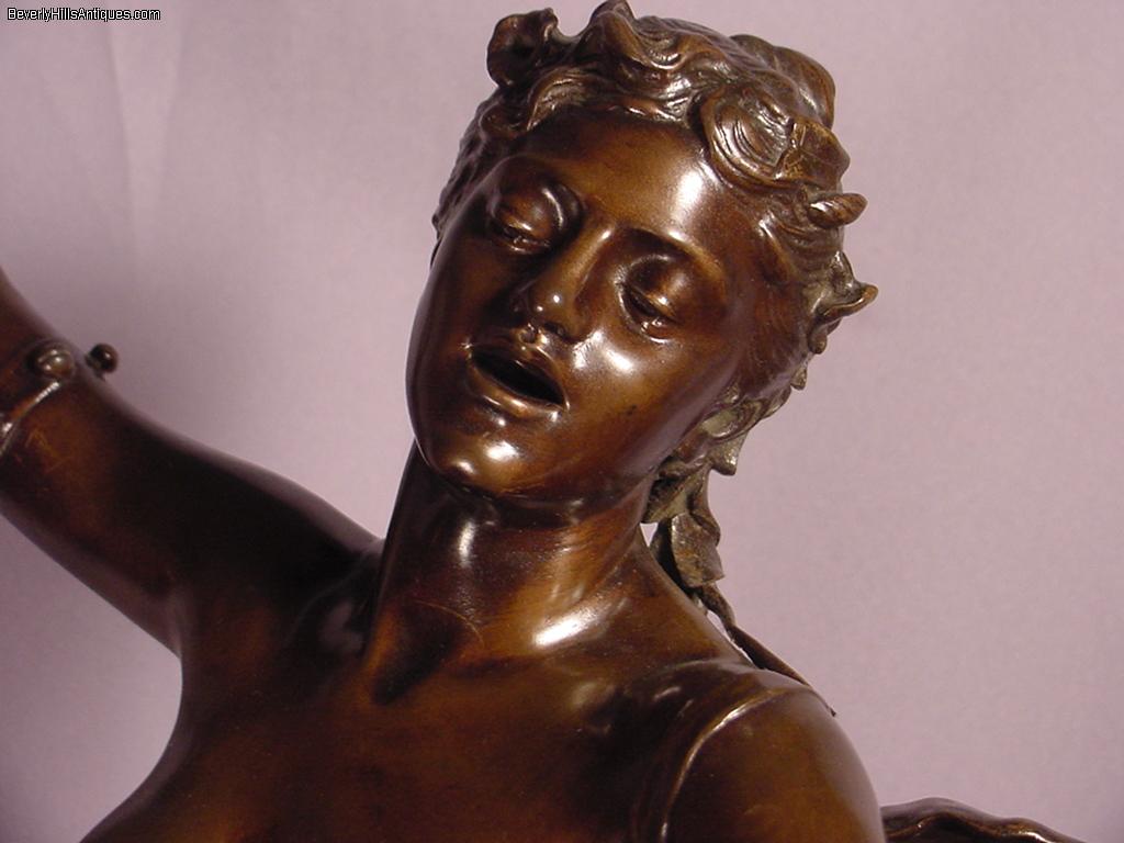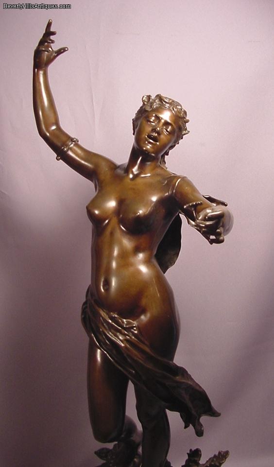 Exquisite antique bronze nude lady dancer signed Charpentier. She is wearing only a sash draped over one shoulder and an arm band with bells. She holds a little flower in her hand as she dances. Her right foot stands on sheets of music, a jester head, and a tambourine. Inscribed on the side is Felix Charpentier and E. Colin & Cie Paris. The bronze measures 26-3/4 inches high. From finger tip to finger tip she measures 14-1/4 inches. The base she stands on measures 6 inches high. Widest width at base 8-1/2 inches including the jester head an foliage on the base. Weight 32 lbs. This sculpture was created in 3 sizes, one monumental, one large and one smaller size. This is the middle size next to the very largest monumental one. It has a medium chocolate brown patina and is in excellent condition. This is one of the most beautiful examples of this model we have had the pleasure to sell and the largest example we have owned. Guaranteed to please the most particular collector or connoisseur.
