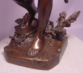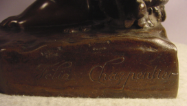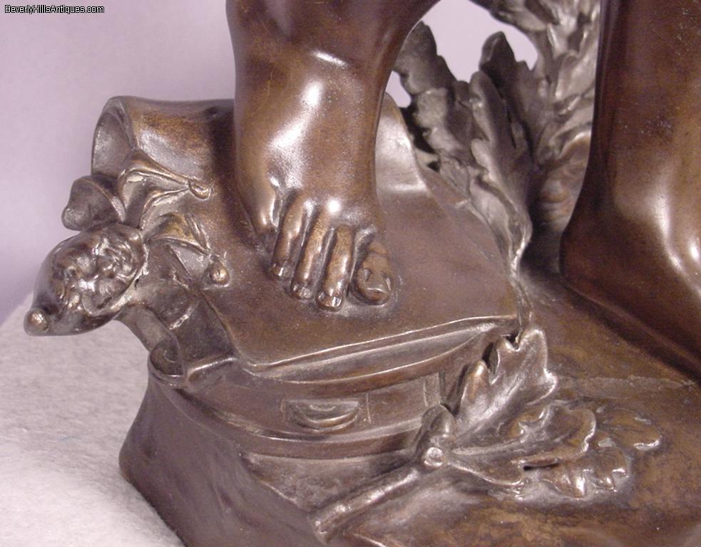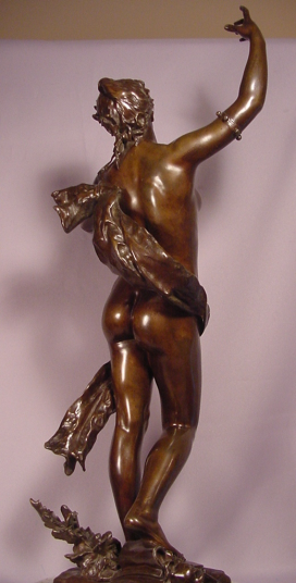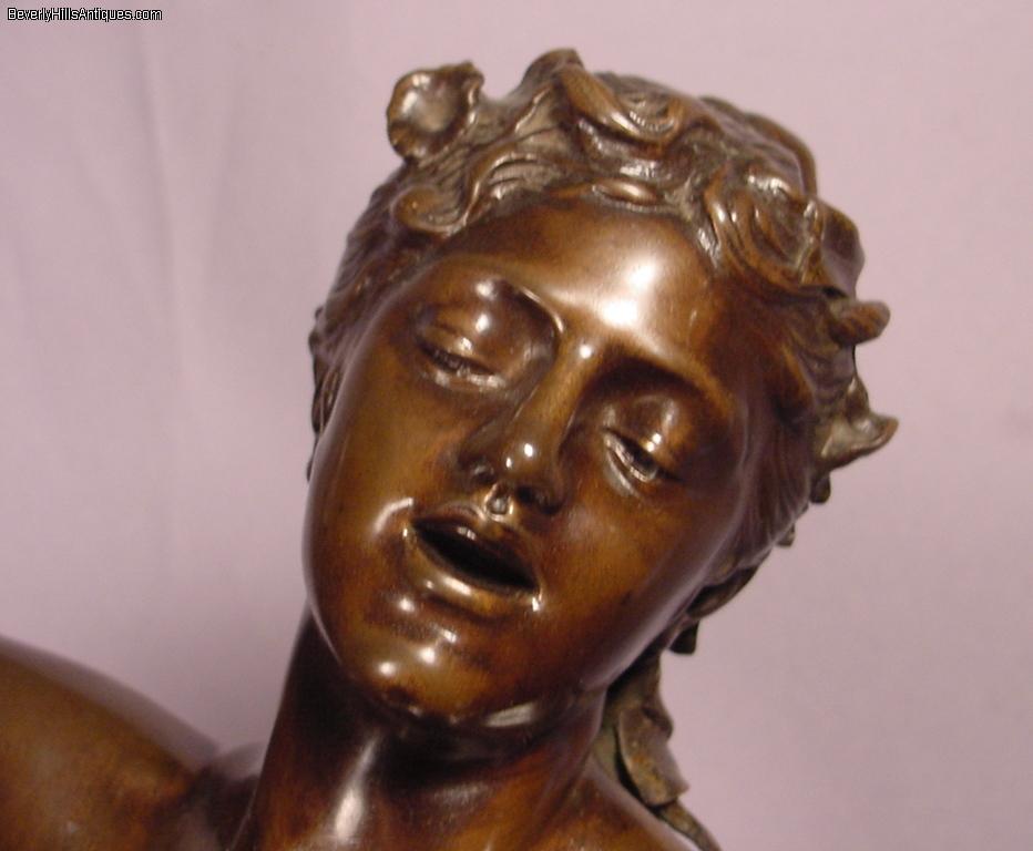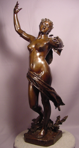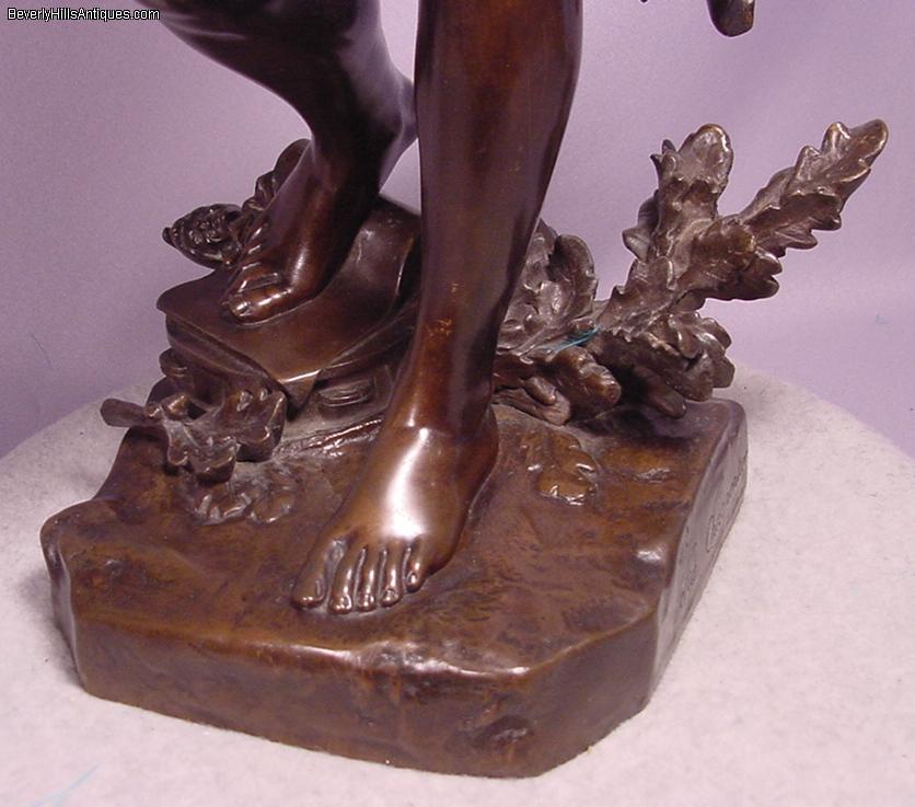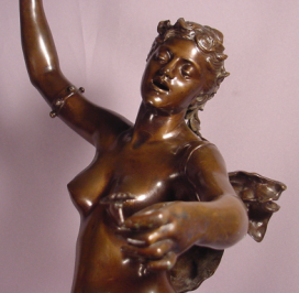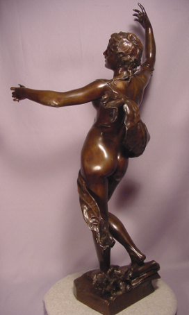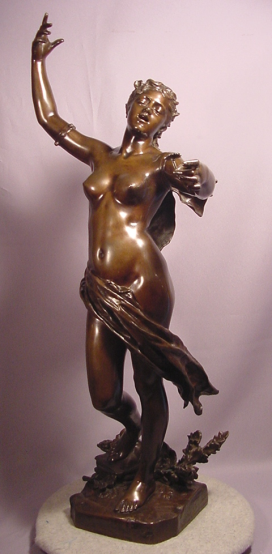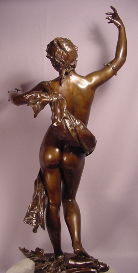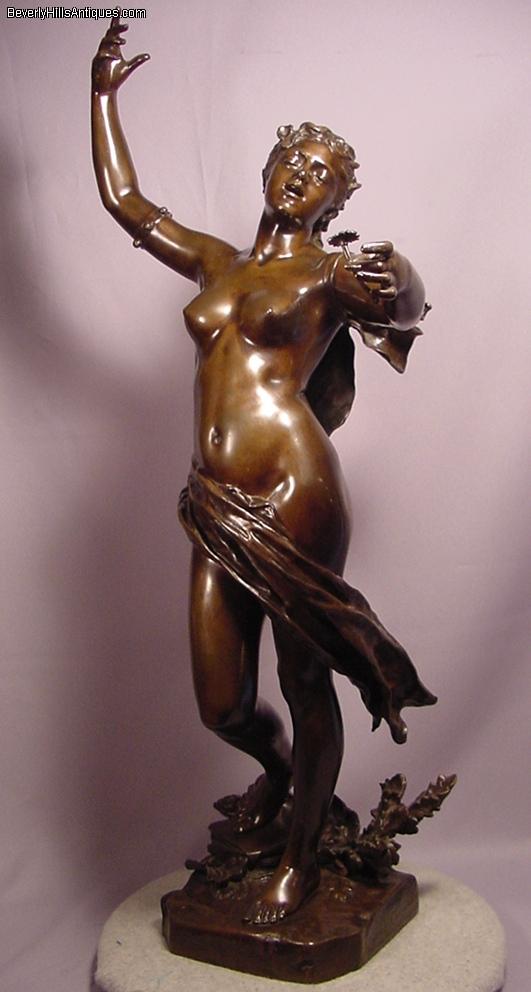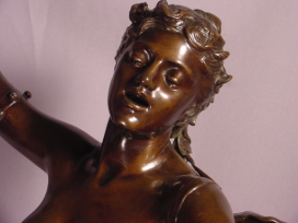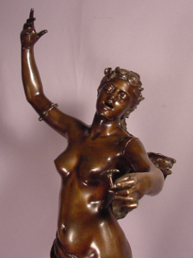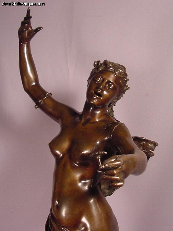 Exquisite antique bronze nude lady dancer signed Charpentier. She is wearing only a sash draped over one shoulder and an arm band with bells. She holds a little flower in her hand as she dances. Her right foot stands on sheets of music, a jester head, and a tambourine. Inscribed on the side is Felix Charpentier and E. Colin & Cie Paris. The bronze measures 26-3/4 inches high. From finger tip to finger tip she measures 14-1/4 inches. The base she stands on measures 6 inches high. Widest width at base 8-1/2 inches including the jester head an foliage on the base. Weight 32 lbs. This sculpture was created in 3 sizes, one monumental, one large and one smaller size. This is the middle size next to the very largest monumental one. It has a medium chocolate brown patina and is in excellent condition. This is one of the most beautiful examples of this model we have had the pleasure to sell and the largest example we have owned. Guaranteed to please the most particular collector or connoisseur.