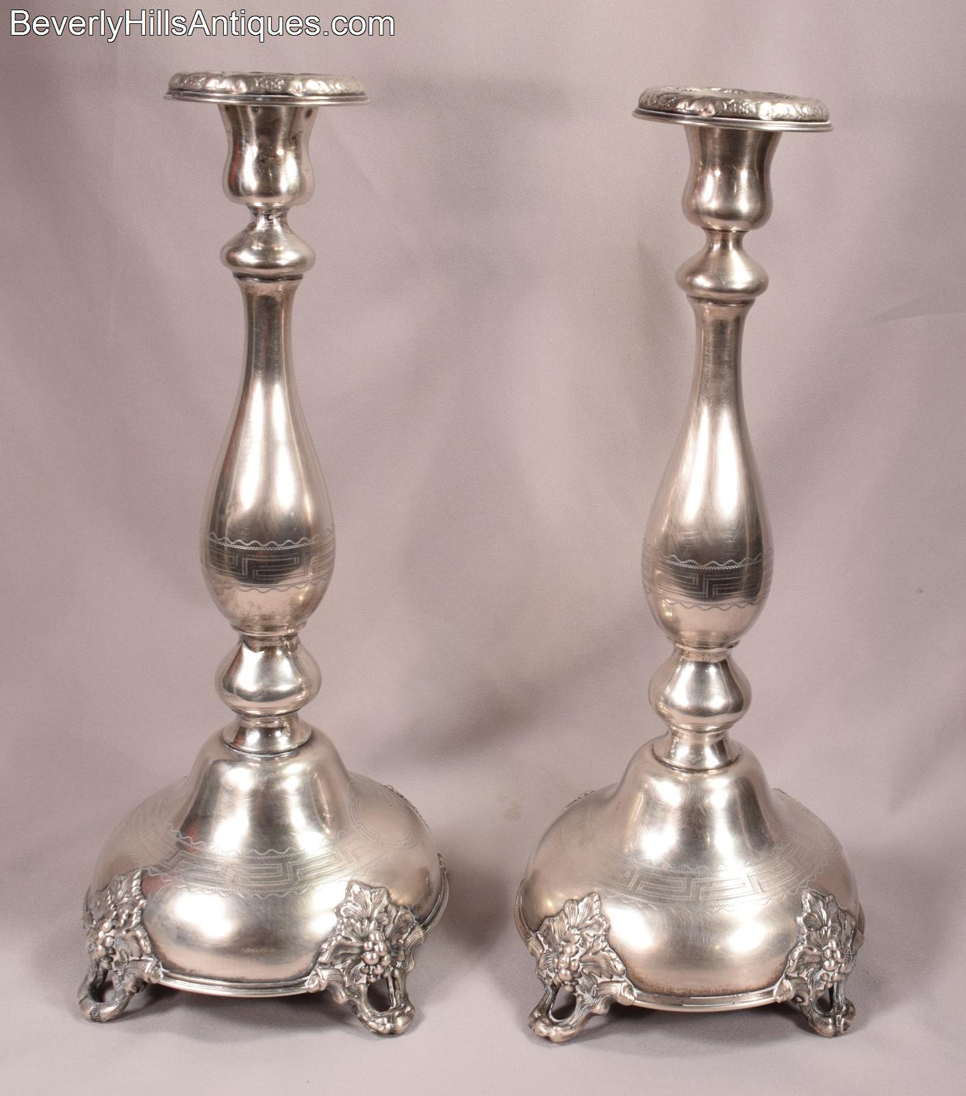 Beautiful pair of antique Sabbath candle sticks marked 800 and also have Viennese Markings next to the 800 purity mark. They measure 14-1/4 inches high and weigh 845.4 grams 27.18 troy ounces. The widest width at the base is 7 inches. Candle sticks like these are hard to find as they are always left to family members that want to keep and use them as their grand parents did. Very few made it to this country from Vienna and Europe because of world war II. These are a recent estate purchase and are in very good pre-owned condition commensurate with age and use. Guaranteed to please the new owner.