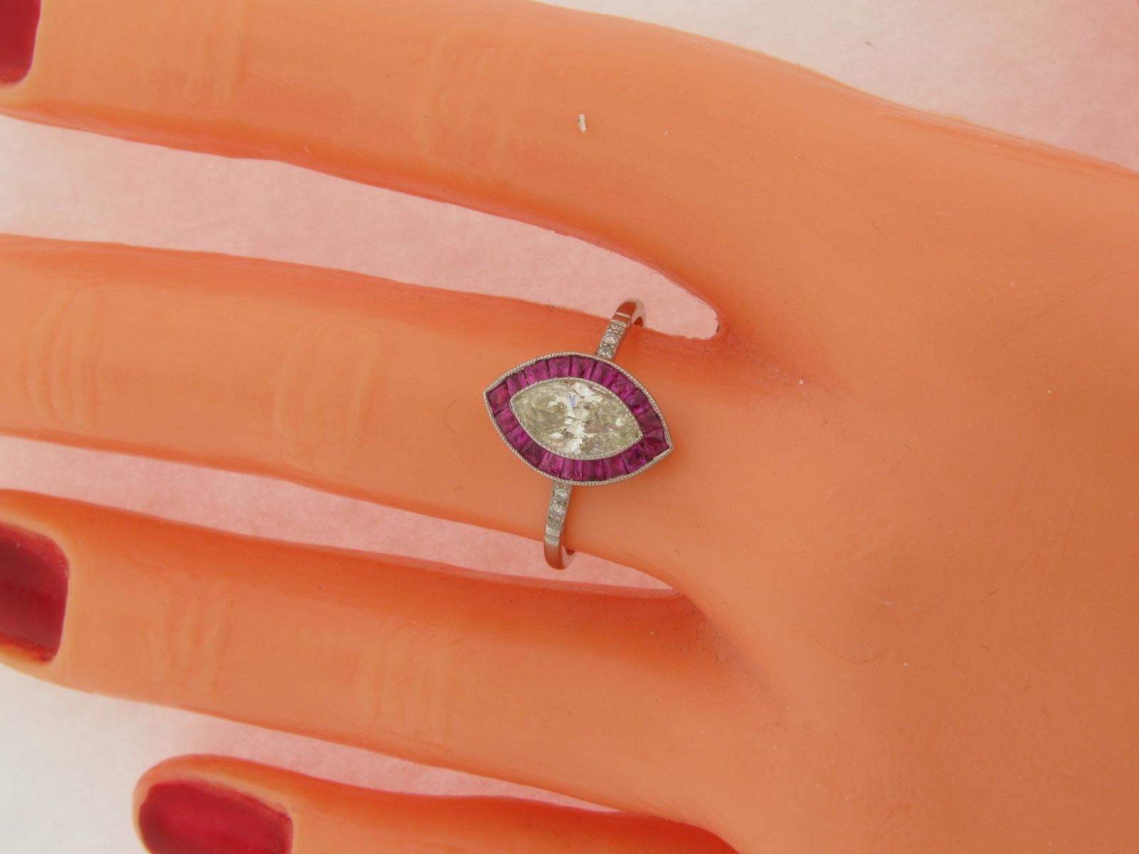 Vintage Art Deco Design .90 Carat Marquise Diamond + 6 Diamonds 18 Rubies Platinum Ring. The center .90 carat marquise diamond is I color and SI-1 clarity. There are 6 additional diamonds 3 on each shoulder of the ring those diamonds are I color and VS2 clarity. The rubies are gem color and clarity ring size is 7-1/4 weight 2.7 grams. This ring is in excellent condition. The inside of the ring shank is inscribed .90 for the diamond weight and 950 for the platinum purity.